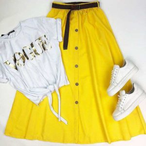 Kemerli Çiçekli Sarı Midi Etek